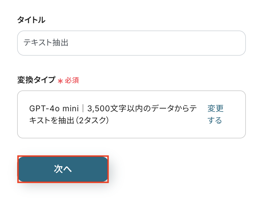 変換タイプ(GPT-4o mini|3,500文字以内のデータからテキストを抽出(2タスク)がデフォルトで設定されているので、確認し「次へ」をクリックします。