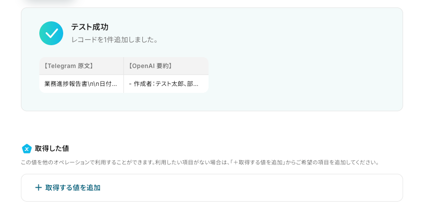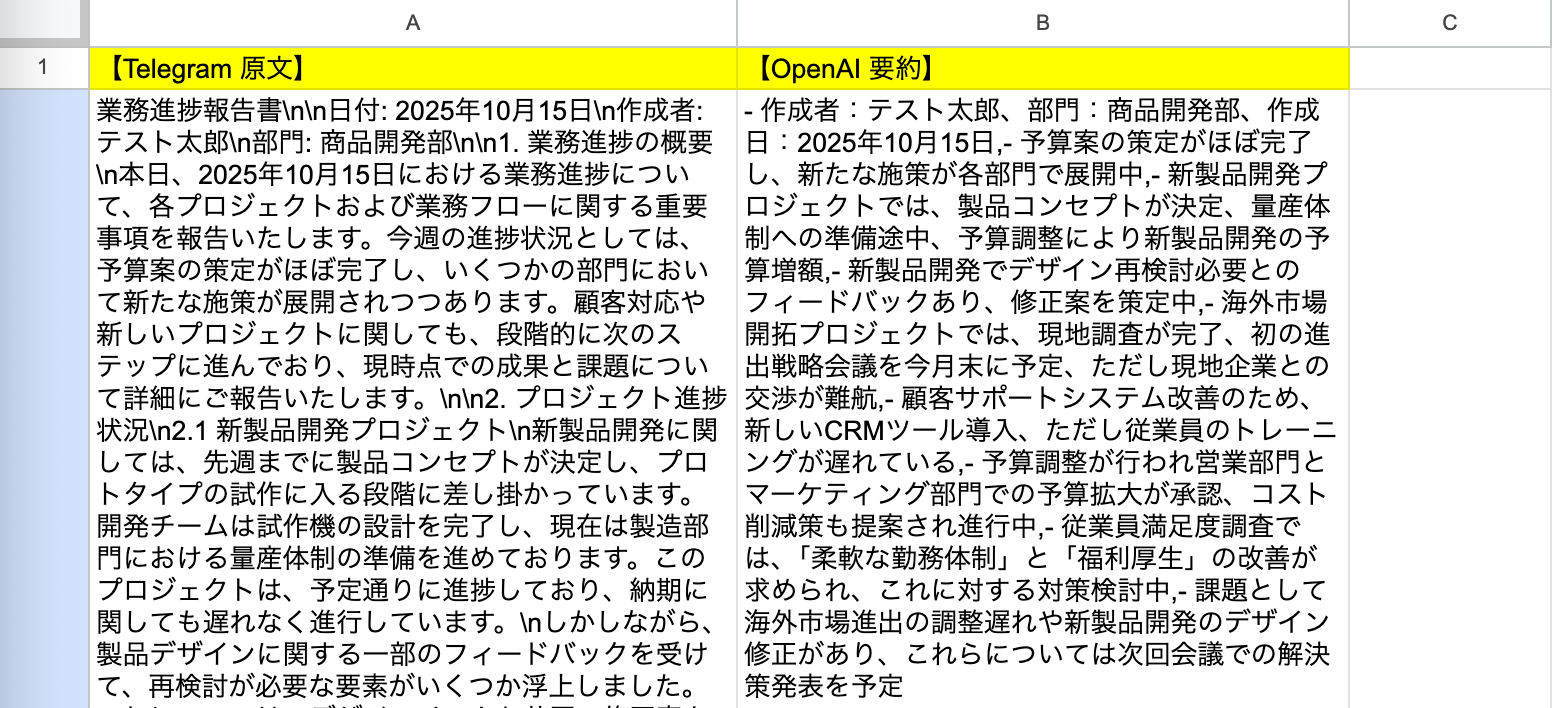 Telegramで新しいメッセージを受信した際、その内容を自動でOpenAIに連携して要約し、結果をGoogle スプレッドシートに記録します。