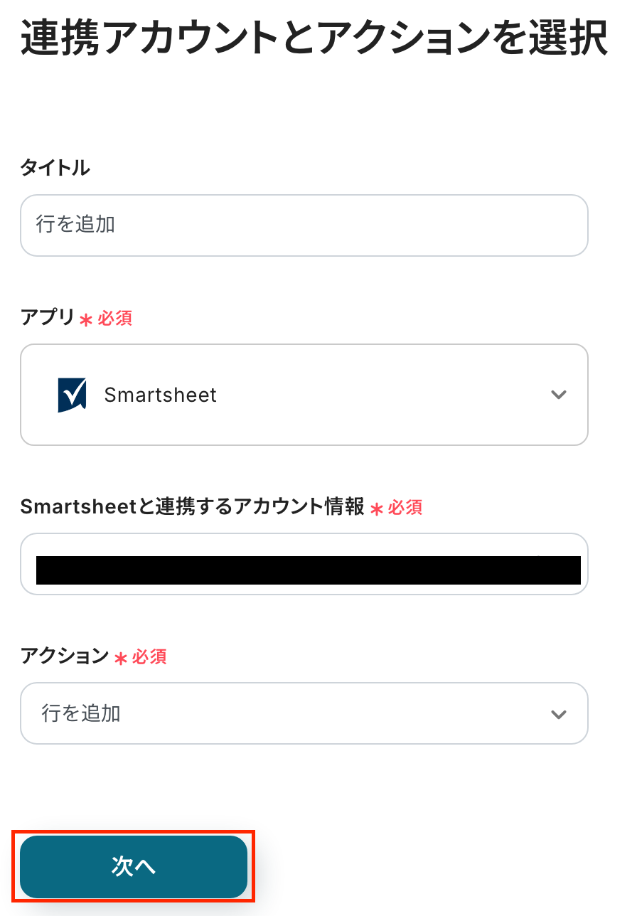 最後の設定です! ここでは、Smartsheetに行を追加する設定を行います。
