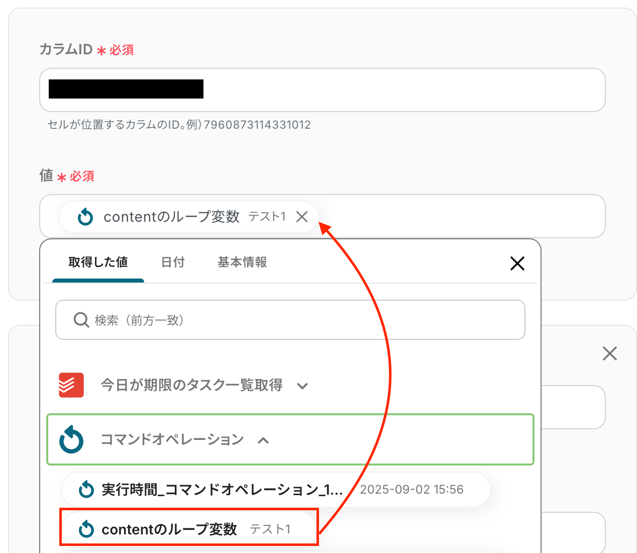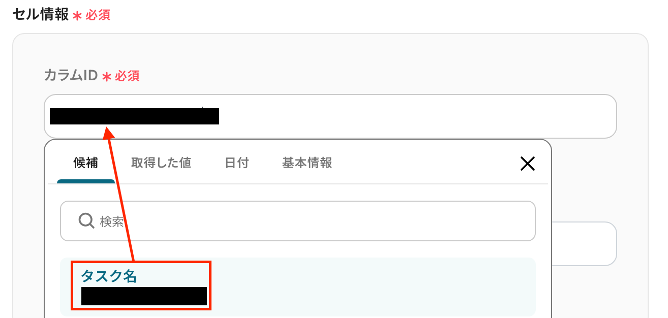 「カラムID」 :入力欄をクリックして表示される候補から選択します。