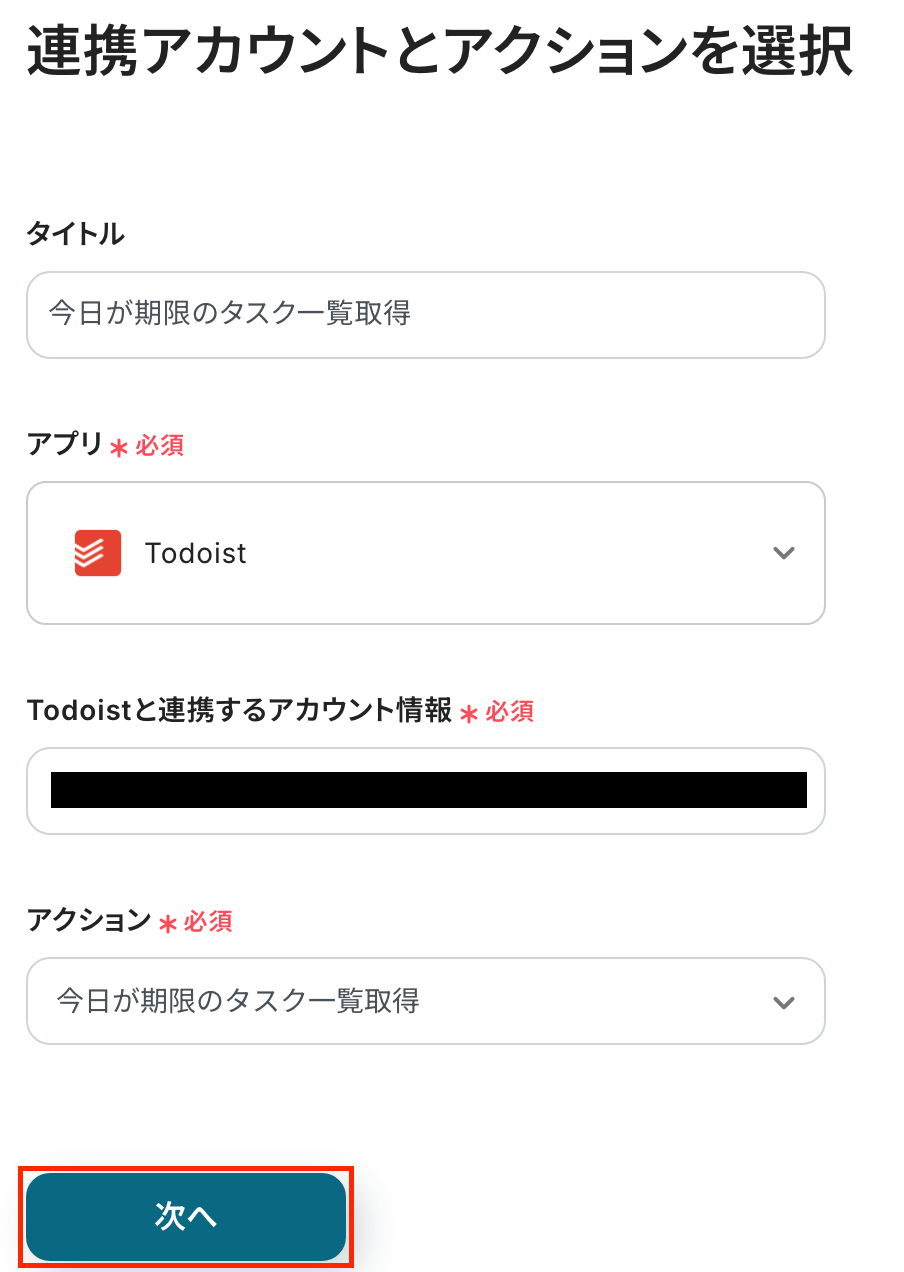 アクション:「今日が期限のタスク一覧取得」を選択