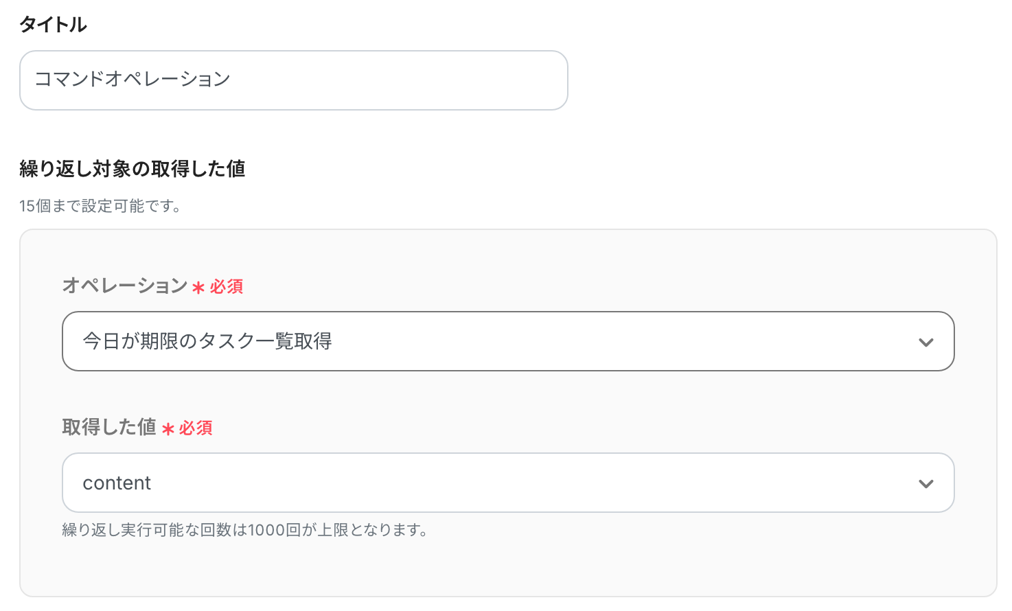 次の画面で、分岐の条件を指定していきます! まずは、「タイトル」を必要に応じて修正します。 「繰り返し対象の取得した値」の「オペレーション」 は、「今日が期限のタスク一覧取得」 を選択してください。「取得した値」 は「content」 を選択しましょう!