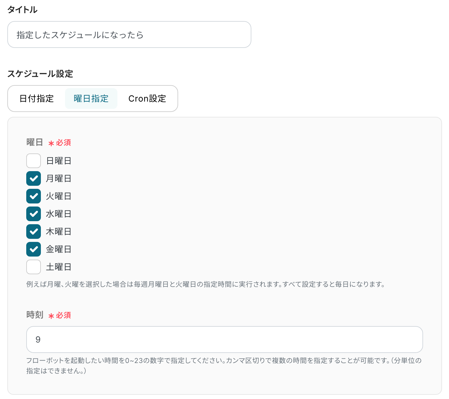 ※スケジュール設定については、スケジュールトリガーの設定方法 を参考にしてください。