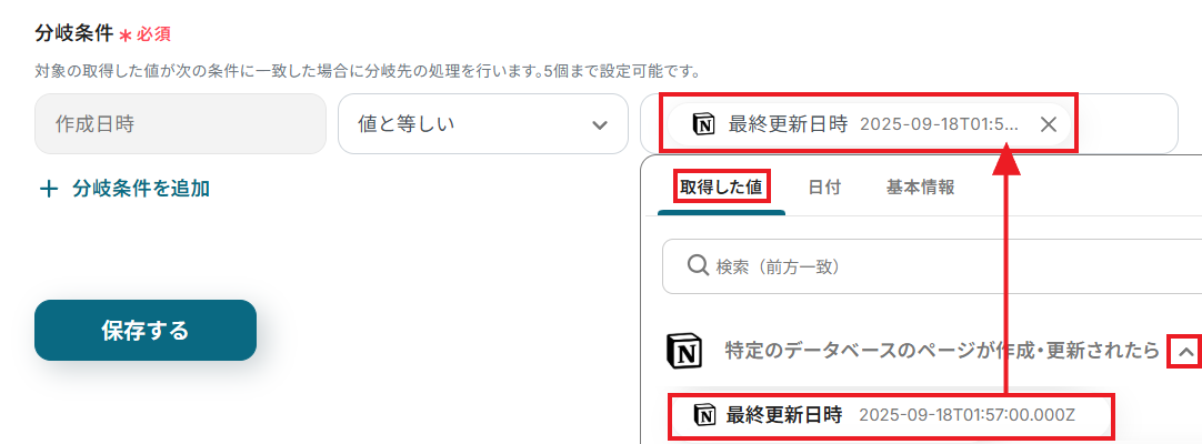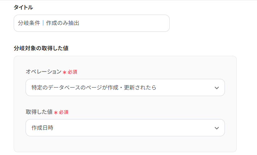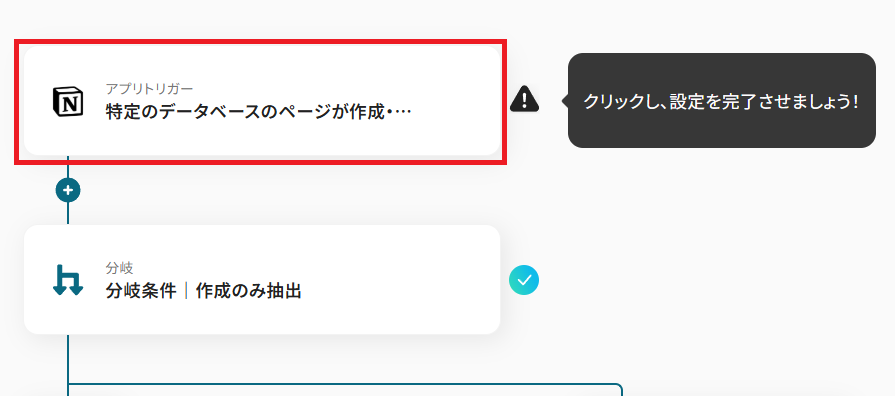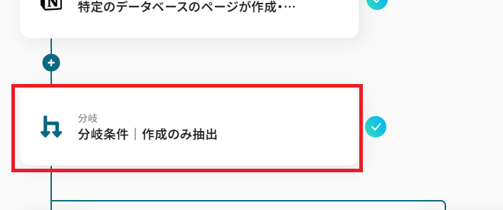 Notionの特定データベースに新しくページが作成されたことをYoomで検知したら、「分岐オペレーション」を設定していきましょう。
