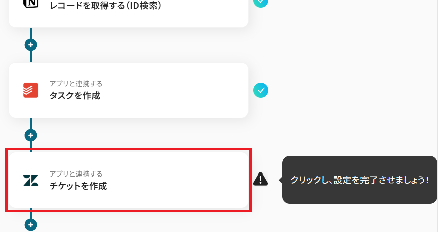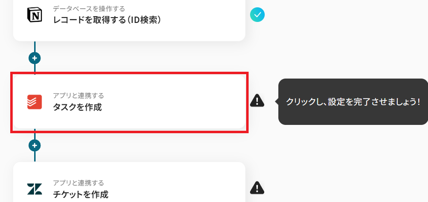 このワークフローを活用すれば、Notionのデータベースにページが作成されるだけで、Todoistへのタスク登録とZendeskへのチケット作成が自動で完了します。