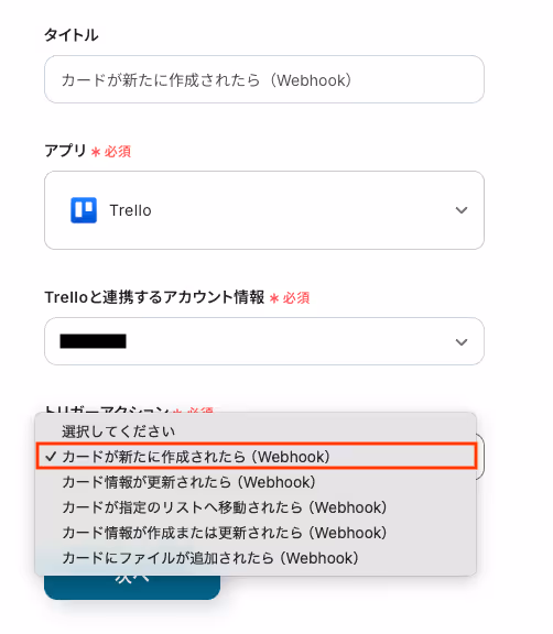 一つ目のオペレーションにある、「カードが新たに作成されたら(Webhook)」をクリックしてください。