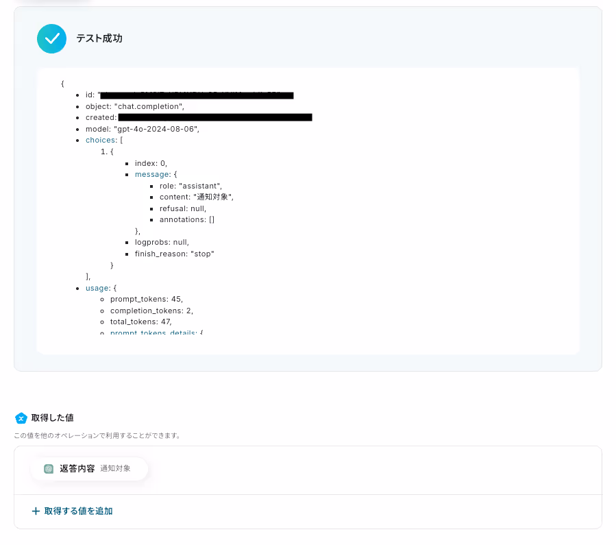 カードを作成後、テストを行い、成功すると以下のように「取得した値」が表示されます。