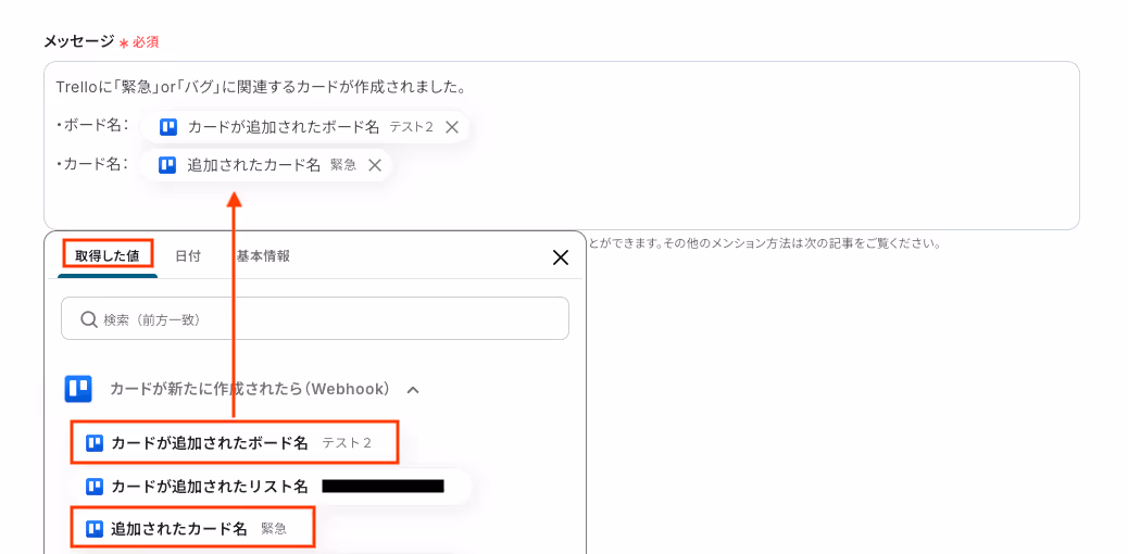 「メッセージ」は取得した値から選択し、必要に応じて任意のテキスト(定型文)を手動で入力してください。