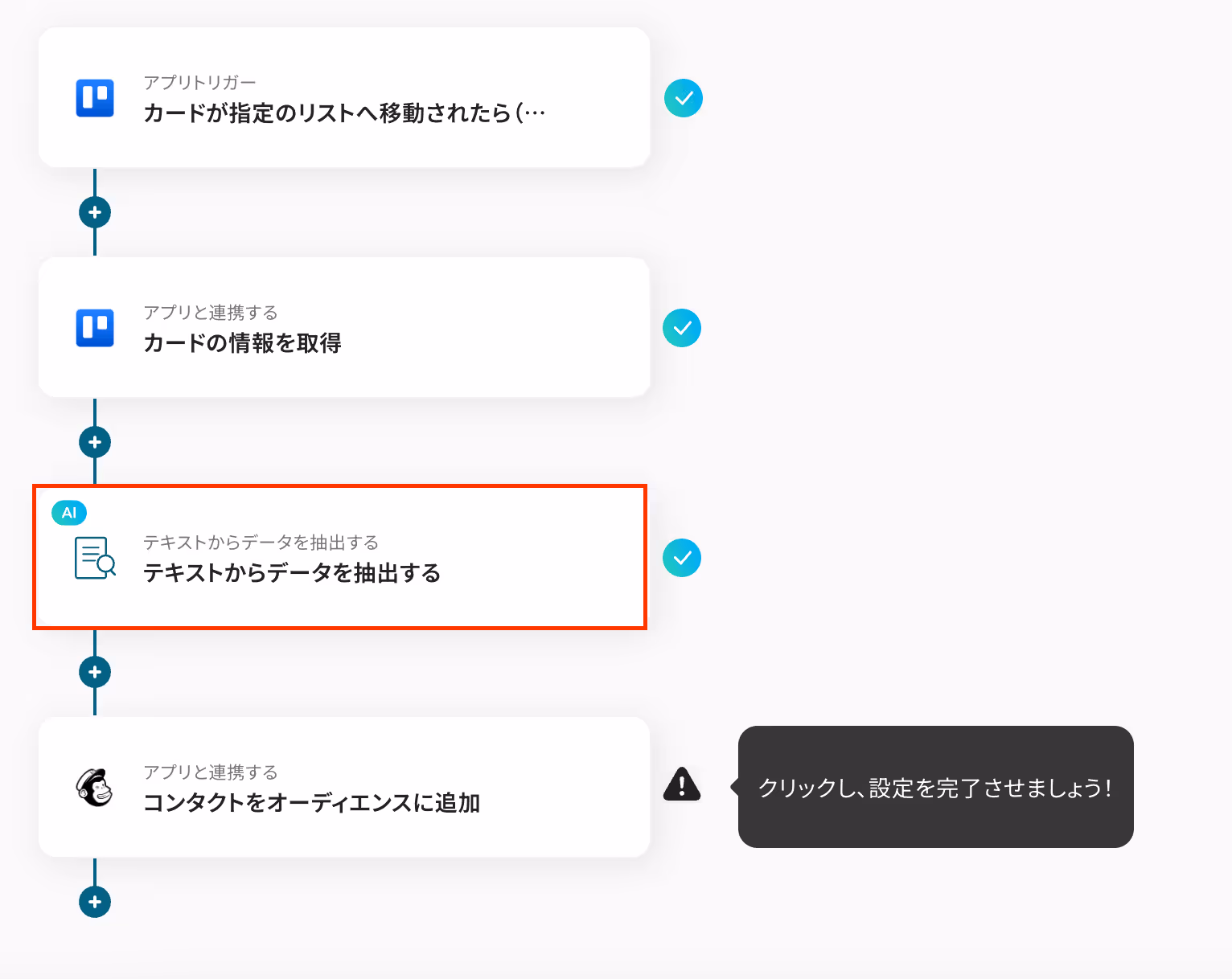 Trelloのカードが特定のリストに移動された際に、AIがカードの記載内容(例えば、問い合わせ内容や顧客の要望など)を分析し、その結果に基づいてMailchimpのオーディエンスにコンタクトを追加します。