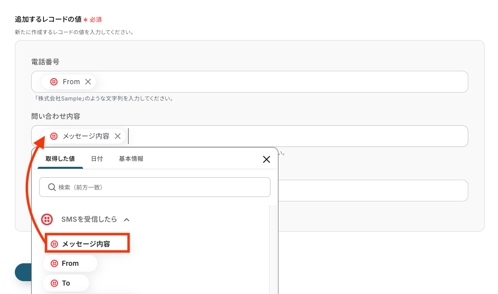 TwilioでSMSを受信した際に、その送信元の電話番号や本文の内容を自動的に抽出し、kintoneのリード情報として新規登録することができます。