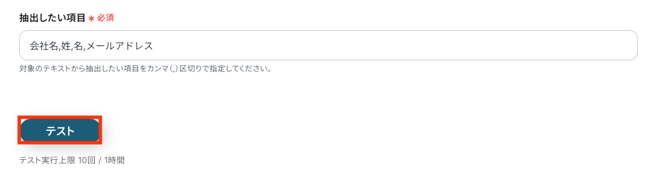 抽出したい項目をカンマ区切りで入力します。 指定した項目が正しく抽出できるかを確認するため、「テスト」をクリックします。 テストが成功したら「保存する」をクリックします。