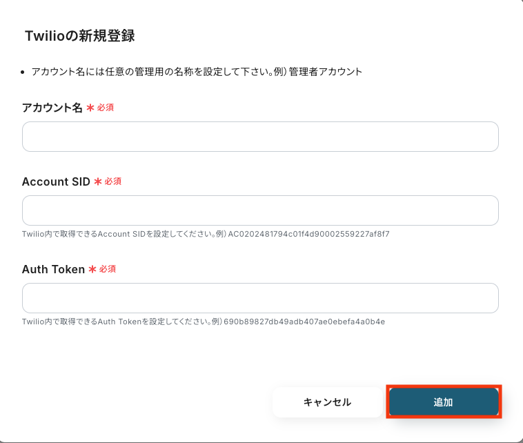 表示された画面で、必須項目を入力し、「追加」をクリックします。