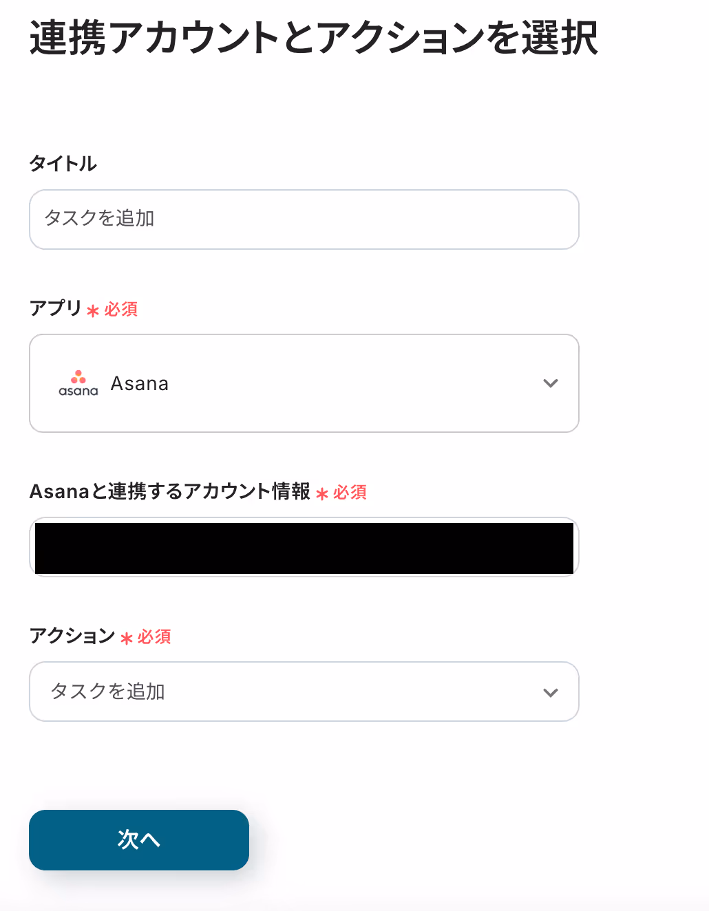 連携アカウントとアクションを選択の画面は、以下を確認して「次へ」をクリックしましょう。