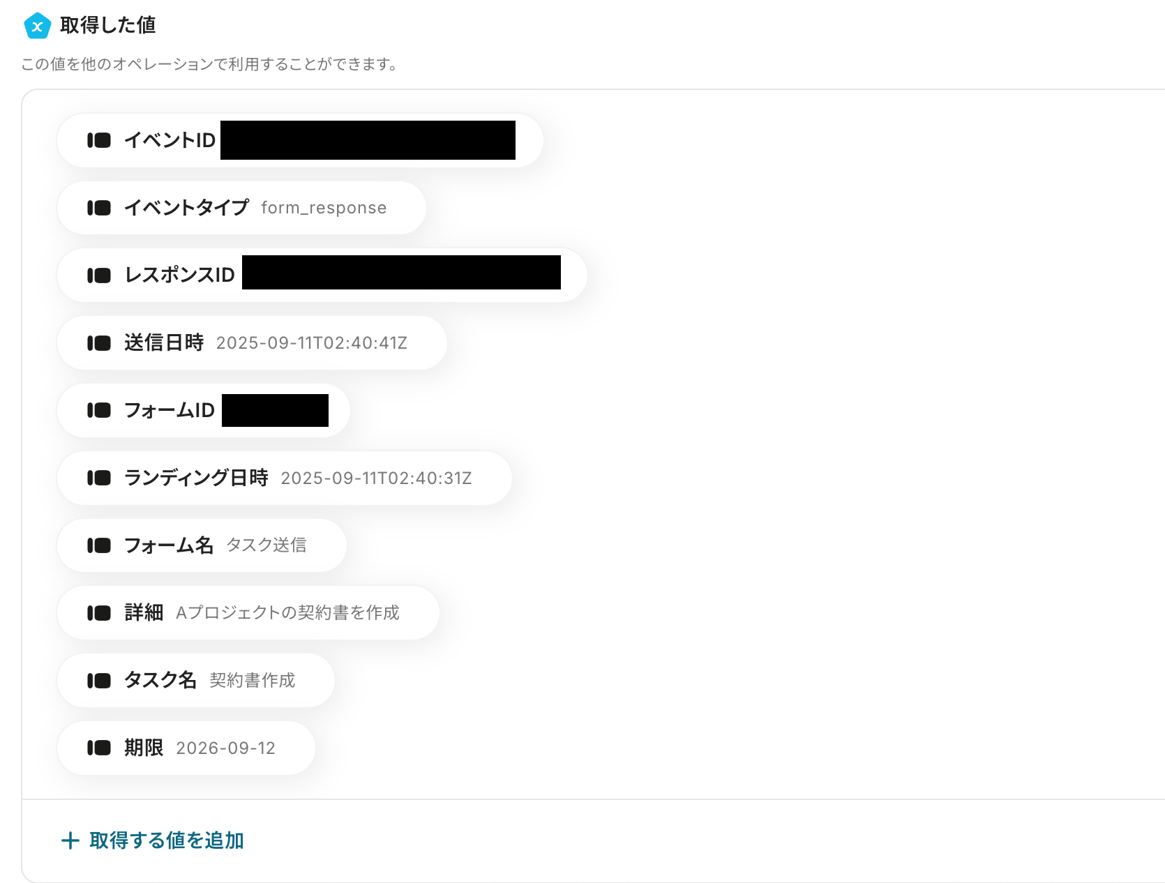 テストが成功したら、取得した値に情報が追加されますが、Typeformの回答情報を取得する場合、こちらの操作が必要になるため、参考にしながら設定してください。