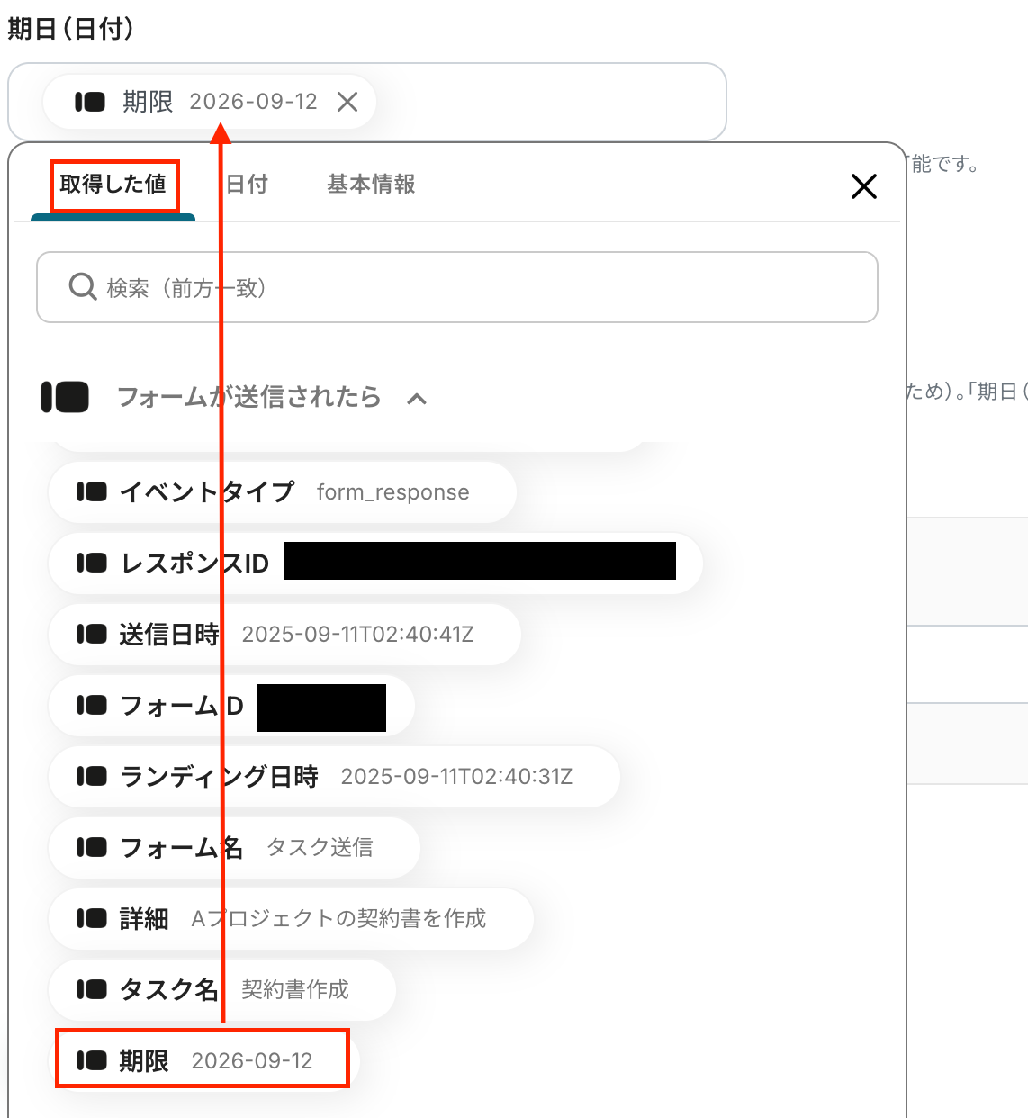 ここでは「タスク名」「詳細」「期限」を回答したという想定で設定していきます。
