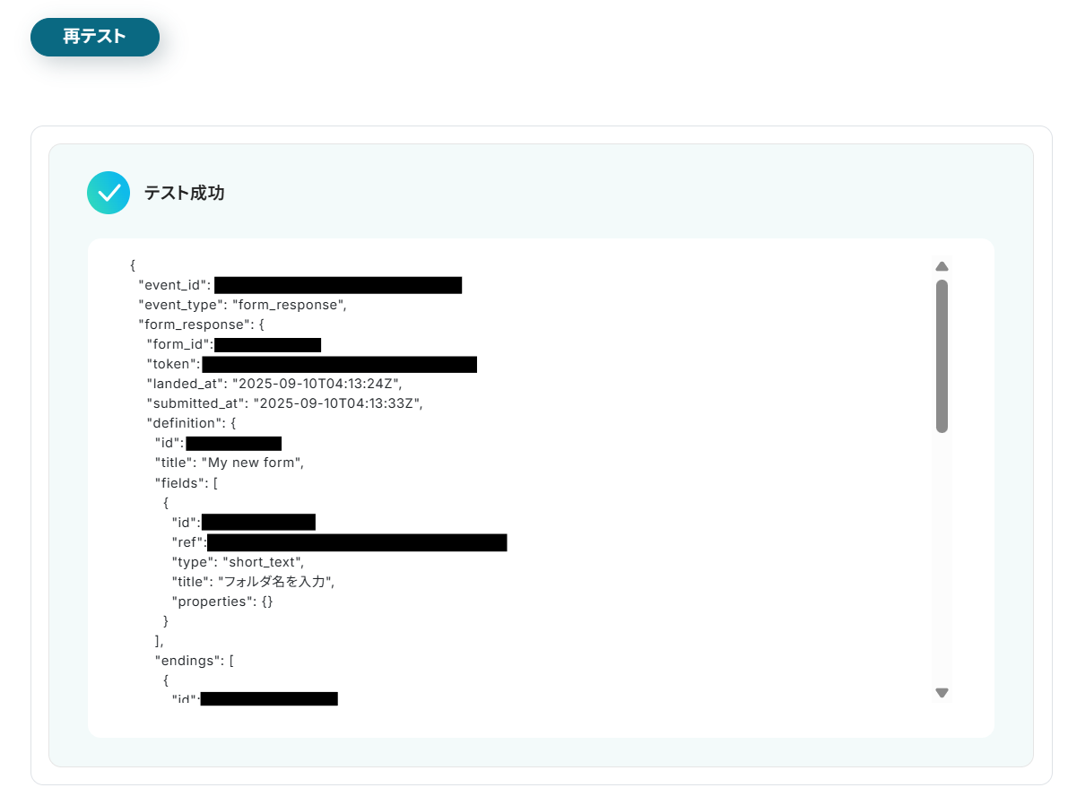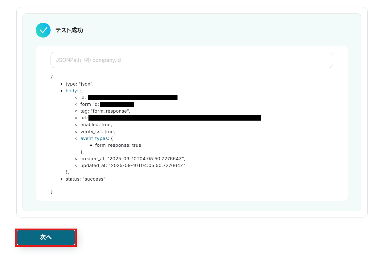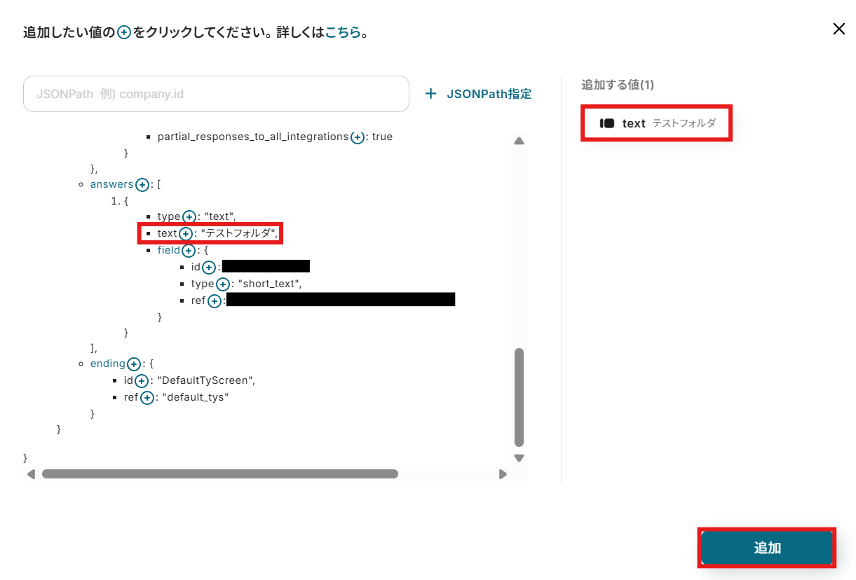 ・TypeformのアウトプットはJSONPathから取得可能です。取得方法は下記をご参照ください。