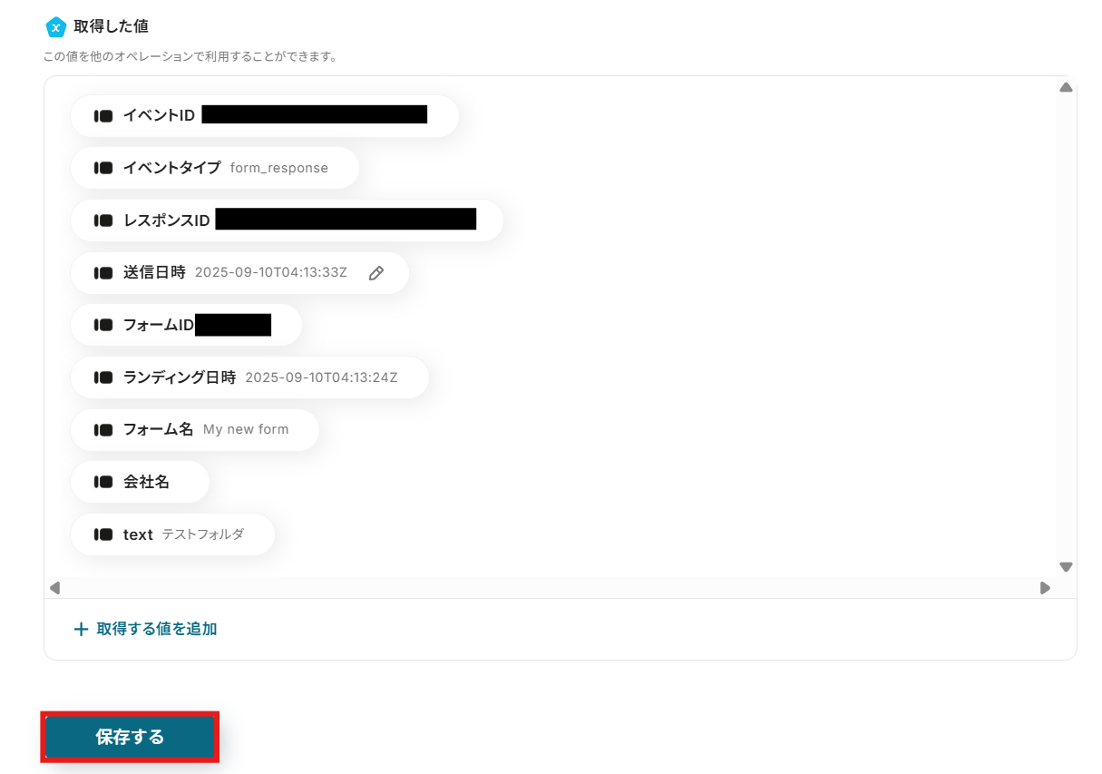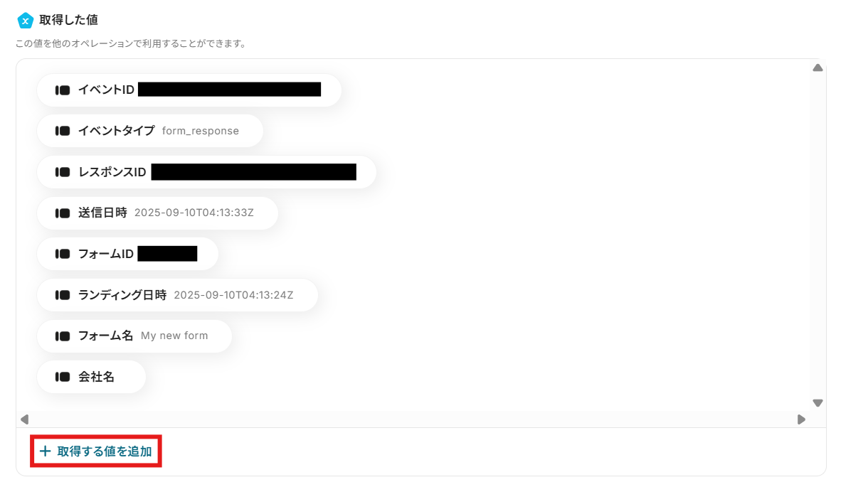 取得した値に、回答を追加するために「取得する値を追加」をクリックしてください。