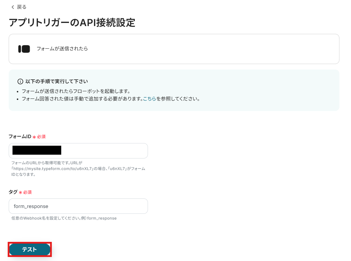 - タグ:任意の値を設定してください。わからなければ注意書きにも記載されている「form_response」を設定しましょう。