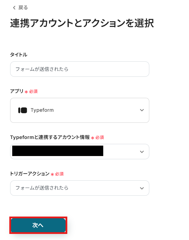 - Typeformと連携するアカウント情報:フローと紐づけるアカウントを選択してください。対象のアカウントがリストに表示されていないときは「アカウントを追加」から追加が可能です。