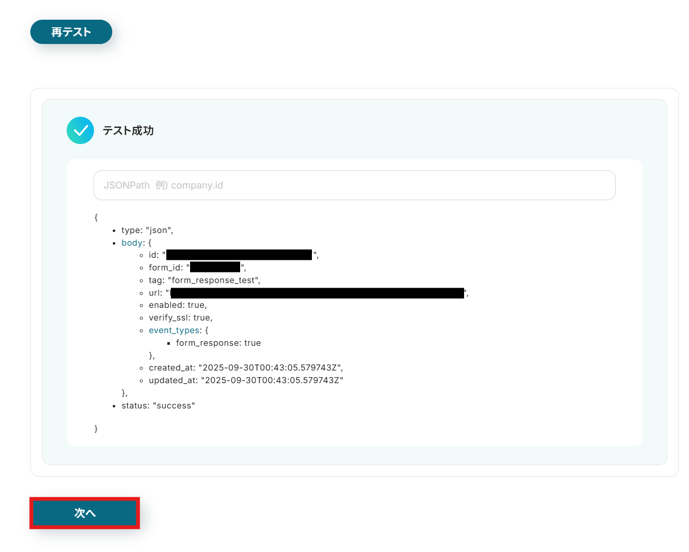 成功すると、「テスト成功」という画面が表示され、Typeformから取得した情報を引用できるようになります。