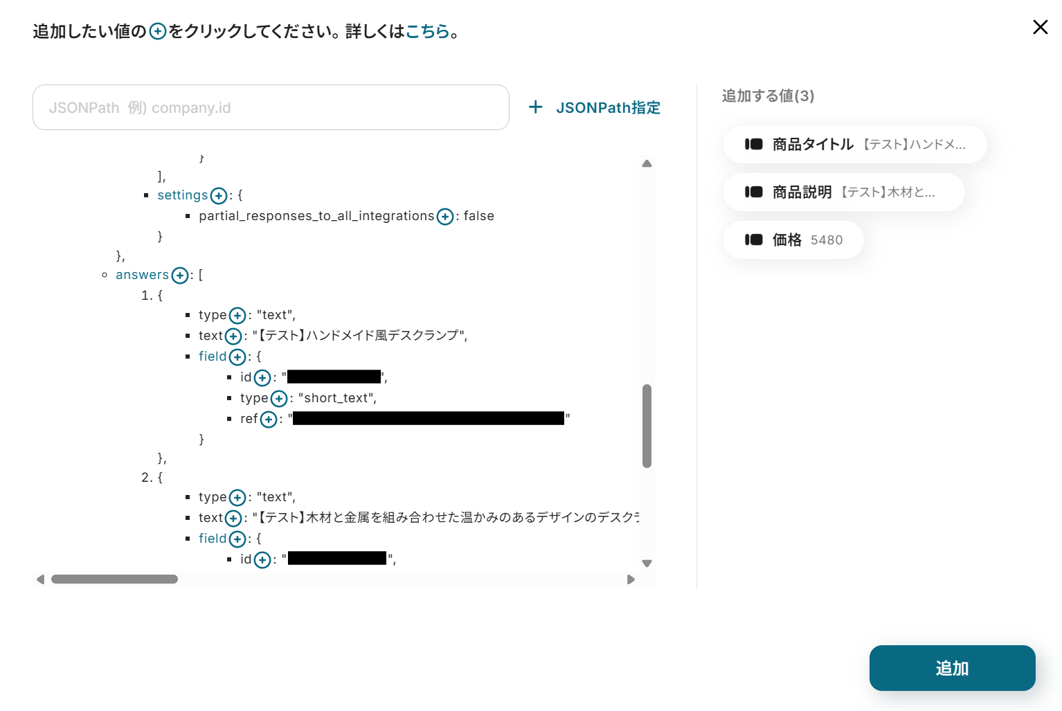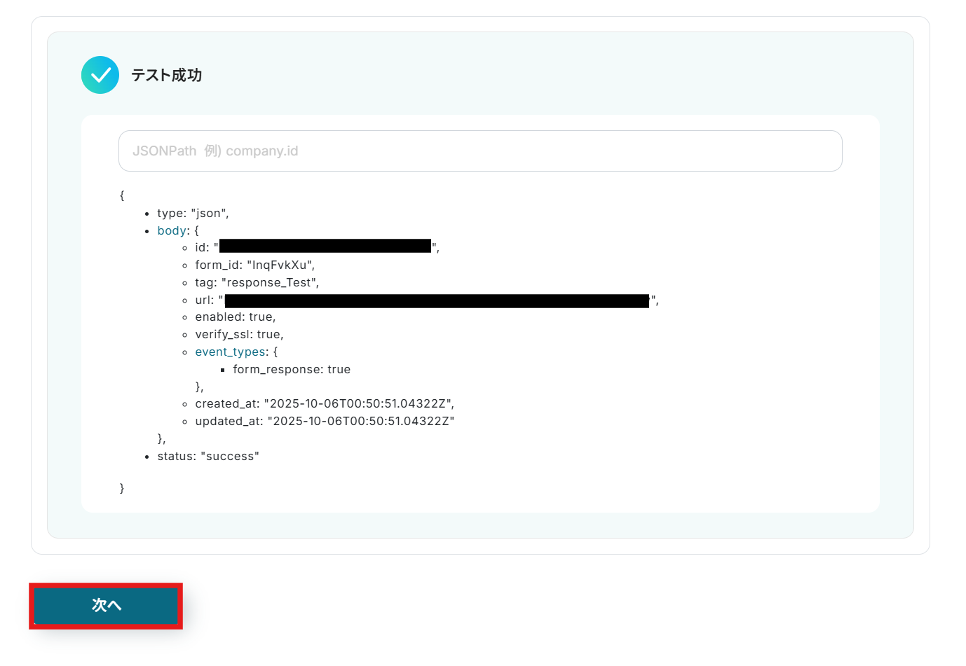 ・TypeformのアウトプットはJSONPathから取得可能です。取得方法は下記をご参照ください。