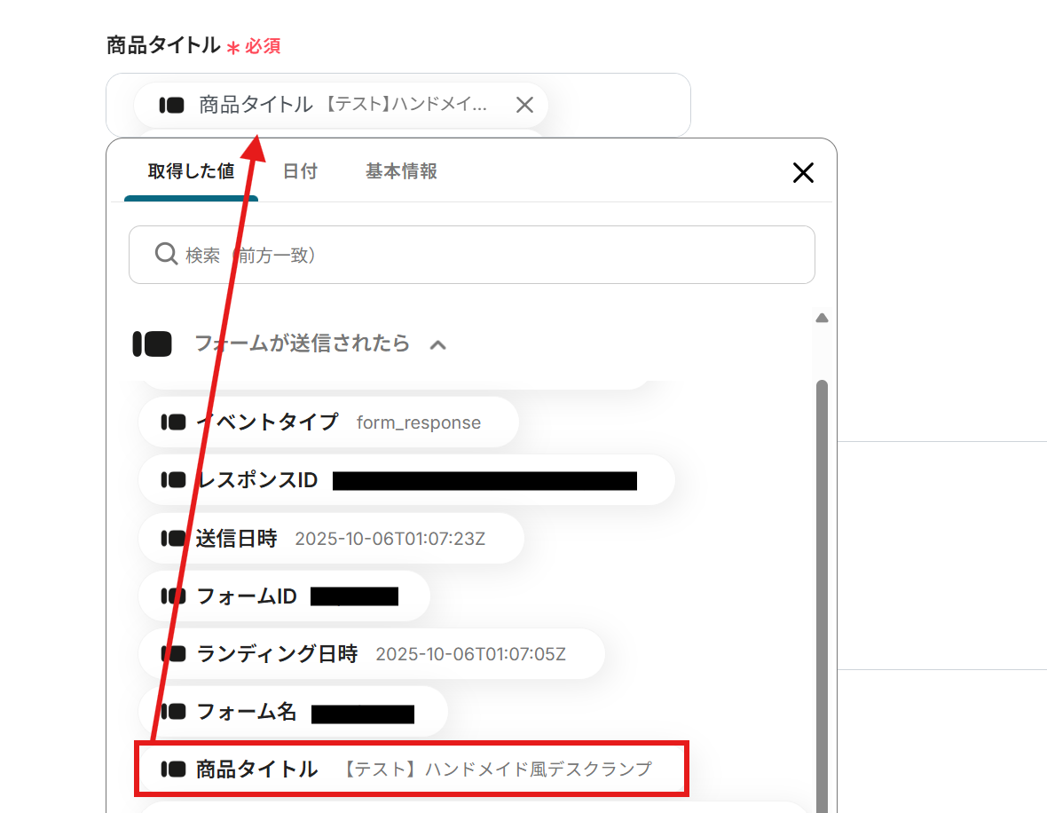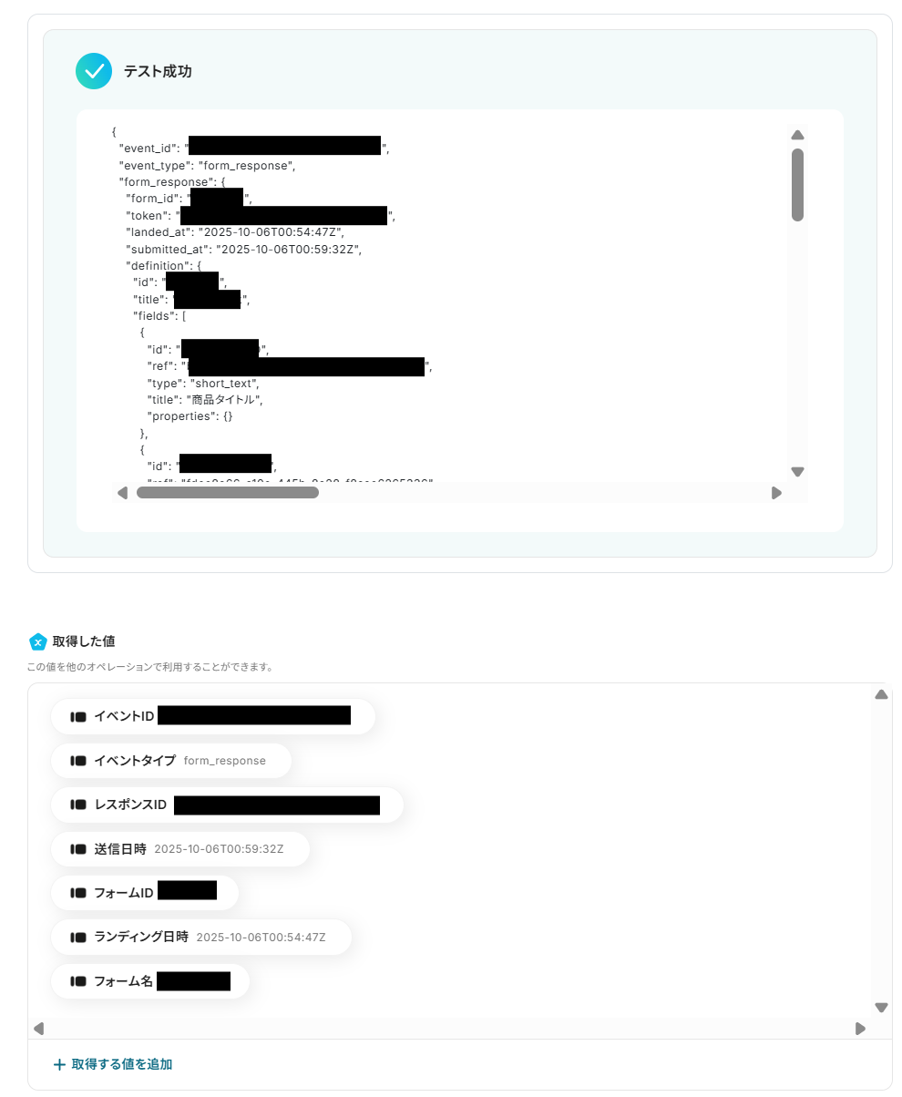 成功すると、「テスト成功」という画面が表示され、Typeformから取得した情報をYoomで引用できるようになります。