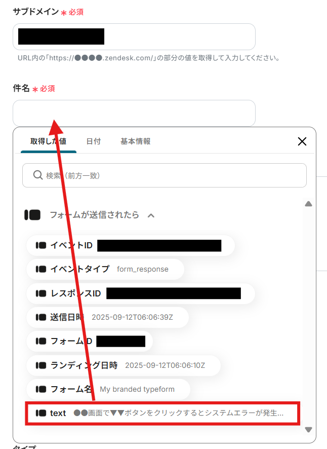 API接続設定画面にてZendeskに作成するチケットの内容を設定していきます。