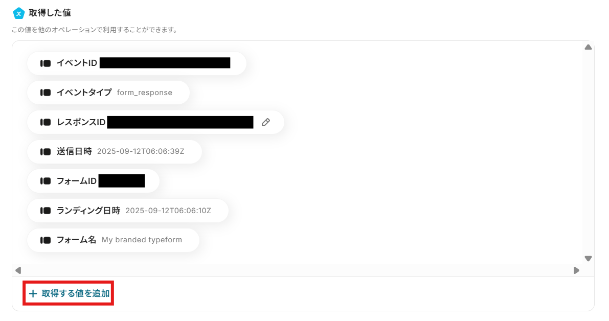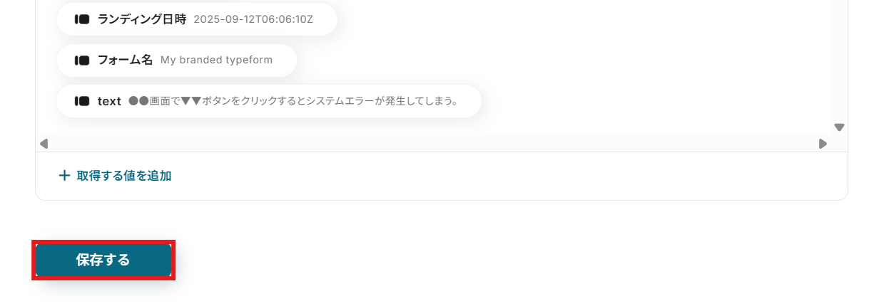 取得した情報より、回答を追加するために「取得する値を追加」をクリックしてください。
