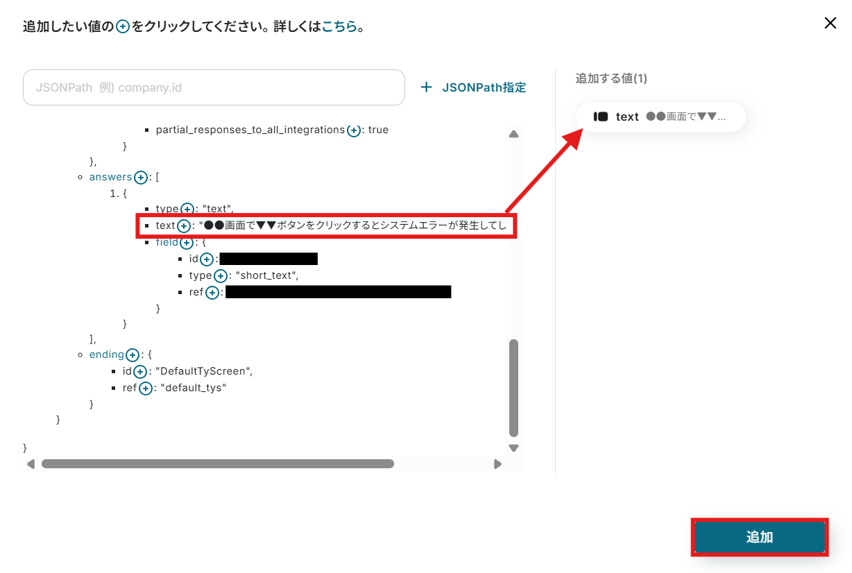 下記ウィンドウが表示されたら、answers→1内にあるtextの+ボタンをクリックしましょう。