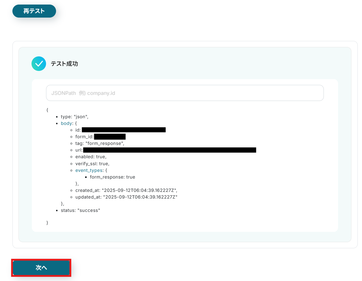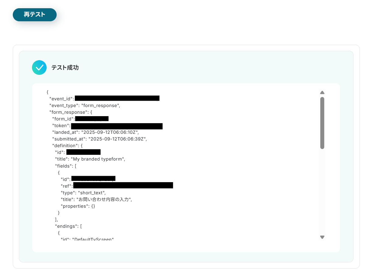 テスト成功が表示されたら、回答の取得完了となります。
