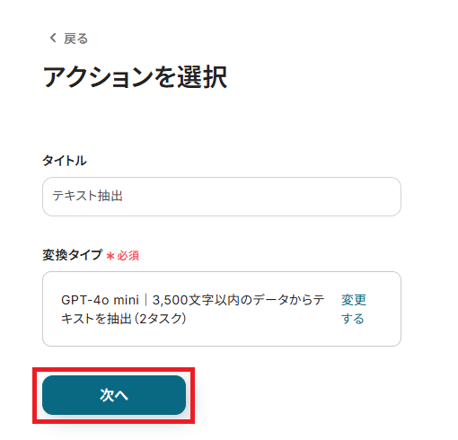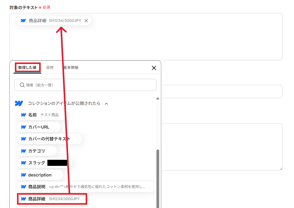 まず、「抽出対象となるテキスト」を取得した値から選択しましょう。