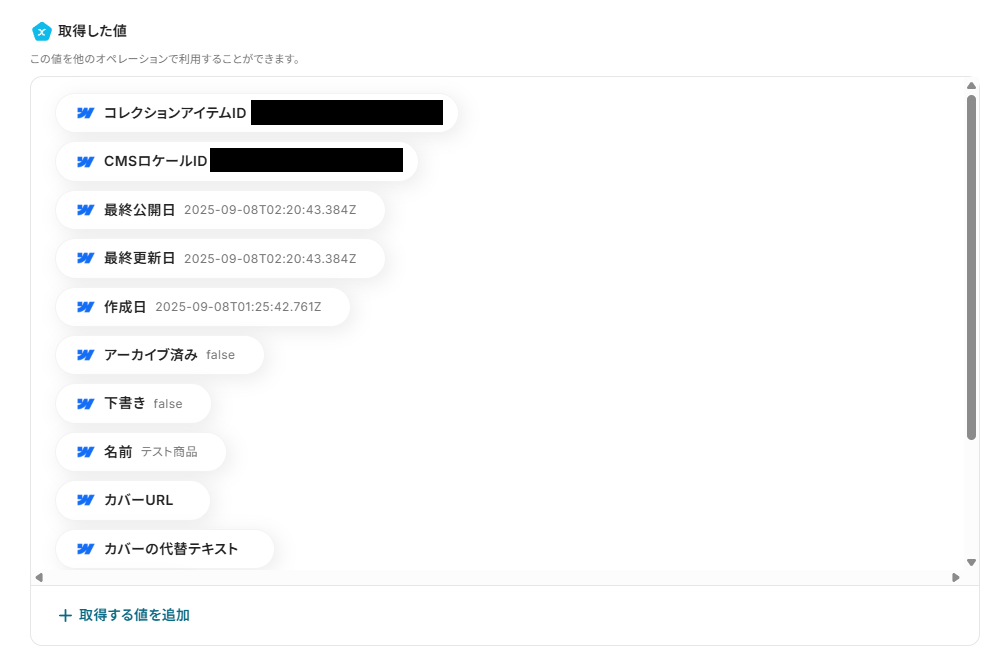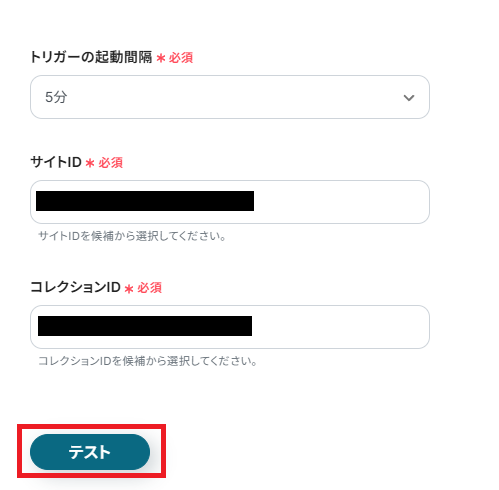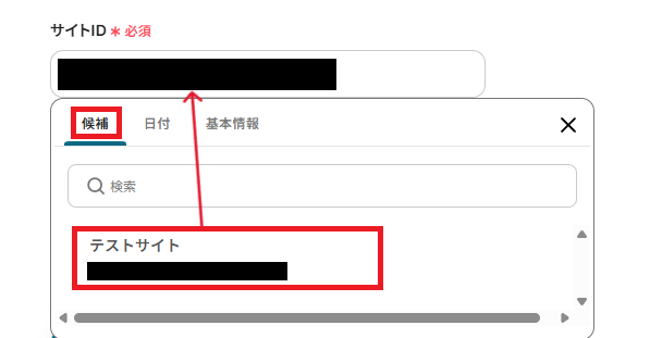 「サイトID」は、候補からマイアプリ連携をしたWebflowアカウントのサイトを選択してください。
