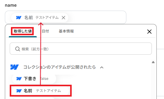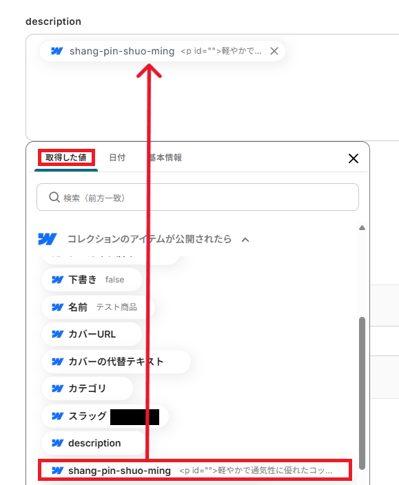 Webflowに公開されているアイテムの情報から、Squarespaceの商品作成に必要な情報を抽出する設定を行います。