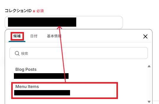 「コレクションID」は、アイテムが登録・公開予定のコレクションを候補から選択してください。