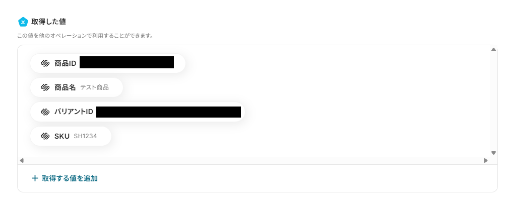 テストが成功すると、下記のような取得した値が表示されます。