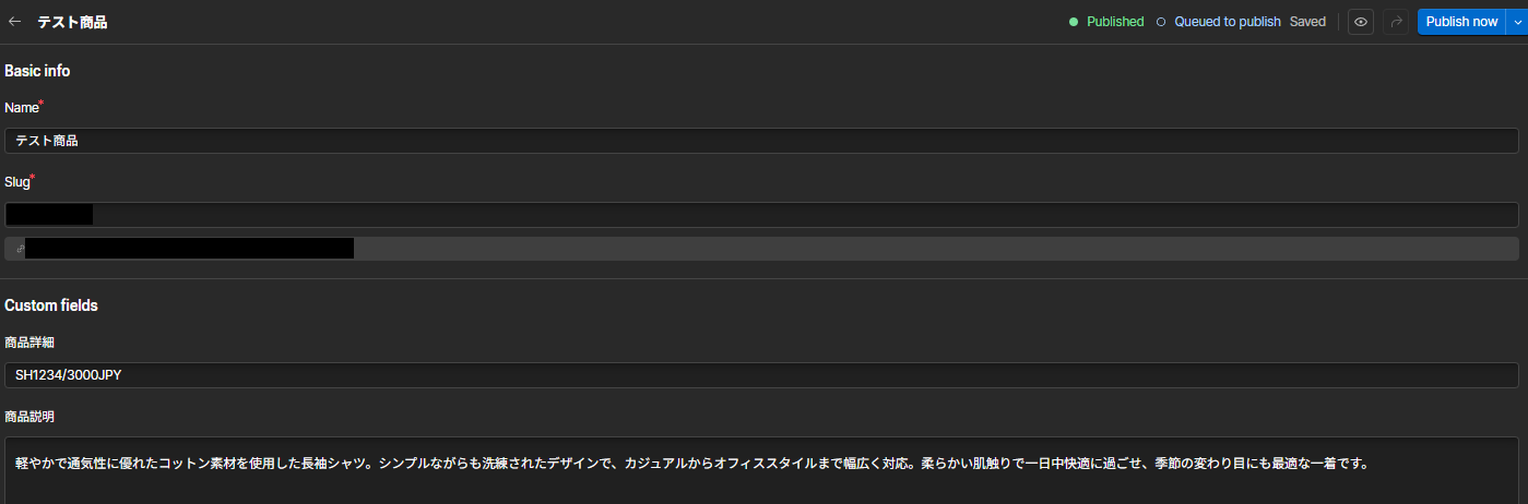 また、Squarespaceに商品を作成することを想定して、上記よりも多くの情報をWebflowのカスタムフィールドから取得することをオススメします。