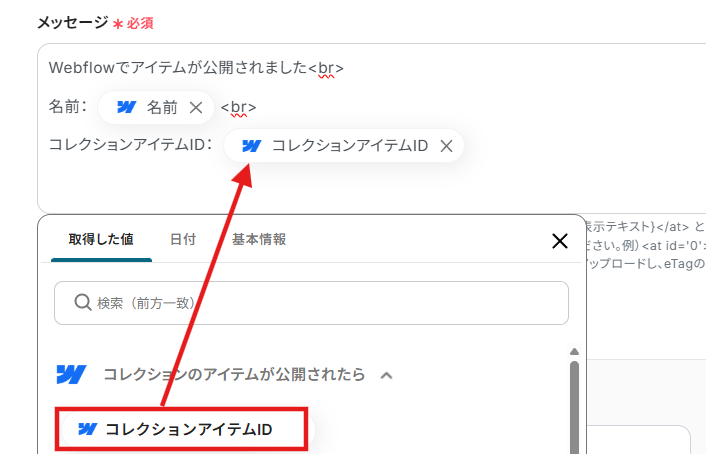 メッセージには以下のようにWebflowから取得した値を用いながら入力します。