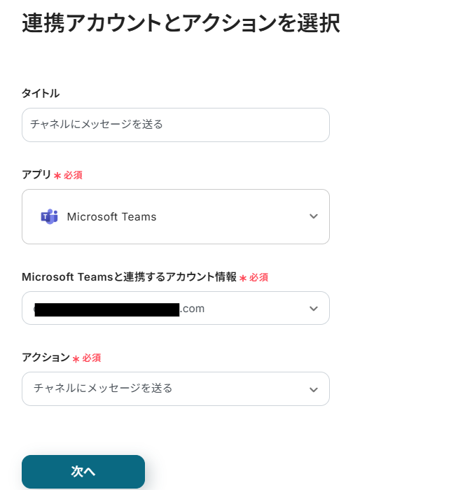 連携アカウントとアクションを選択する画面が表示されるので、今回連携するMicrosoft Teamsのアカウントを確認し「次へ」をクリックします。