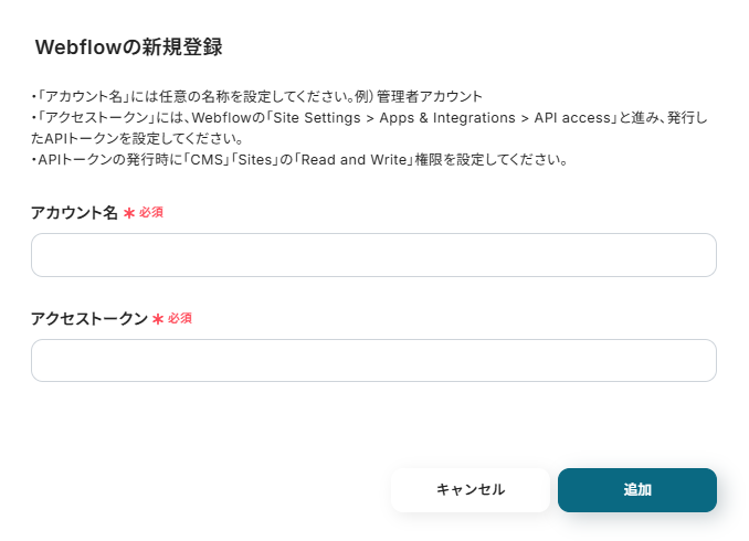 以下の画面が表示されるのでWebflowで確認し入力しましょう。