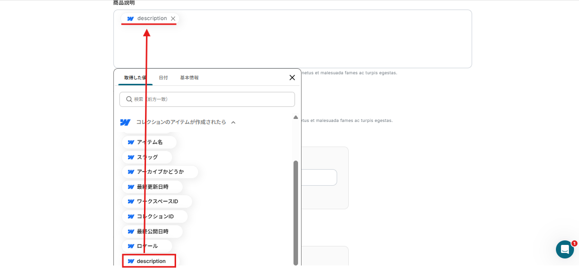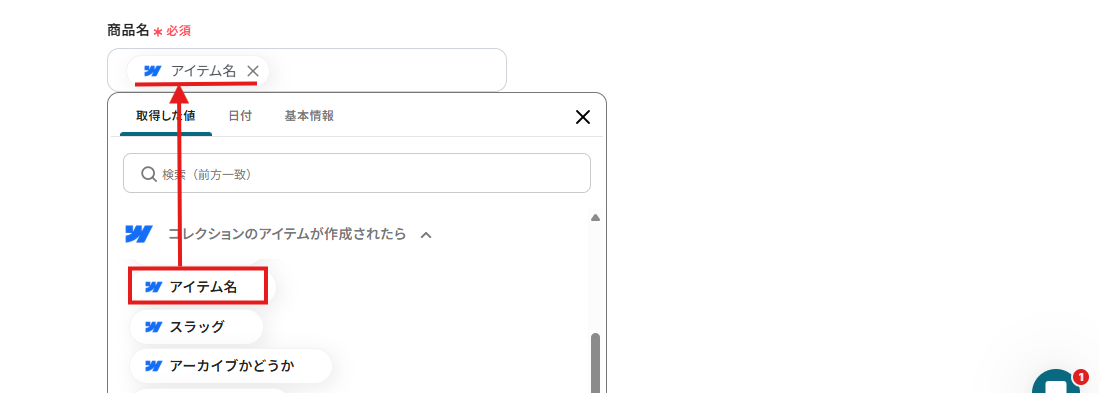 この設定により、Webflowにアイテムが作成されたら「アイテム名」を取得し、WooCommerceの商品名に自動で反映することが可能です。