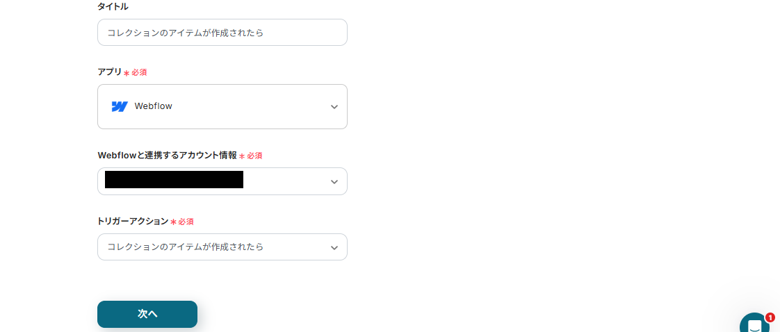 Webflowと連携するアカウントやアクション内容に誤りが無いか確認し、次のページに進みましょう。