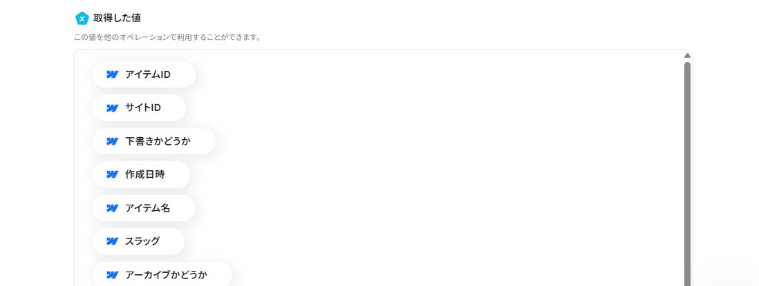 テストが成功したら、Webflowに先ほど作成したアイテムの情報が取得した値(アウトプット)に表示されます。