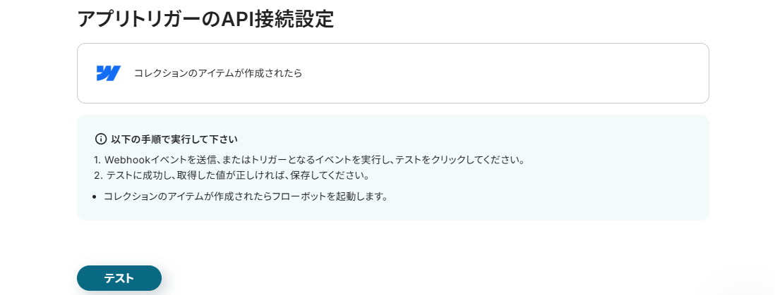 続いて、Webhookの動作テストを行います。Webflowの画面を開き、テスト用にコレクションのアイテムを作成してください。