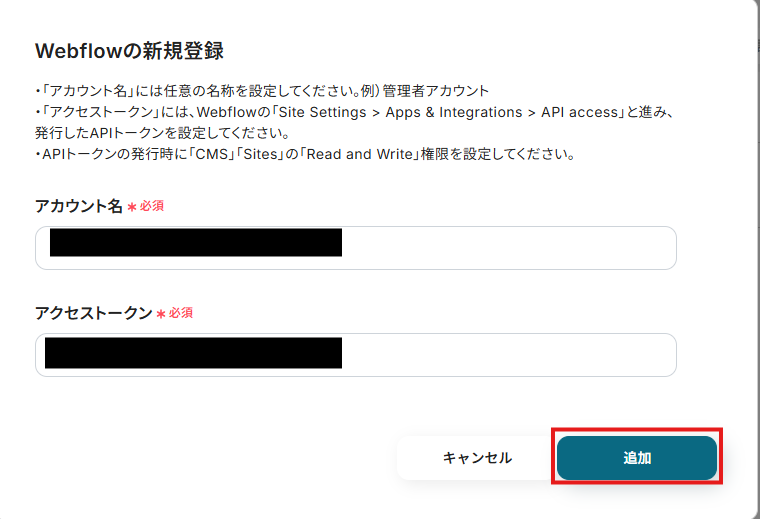 Webflowの新規登録画面が表示されるので、注釈を確認しながら「アカウント名」と「アクセストークン」を入力しましょう。