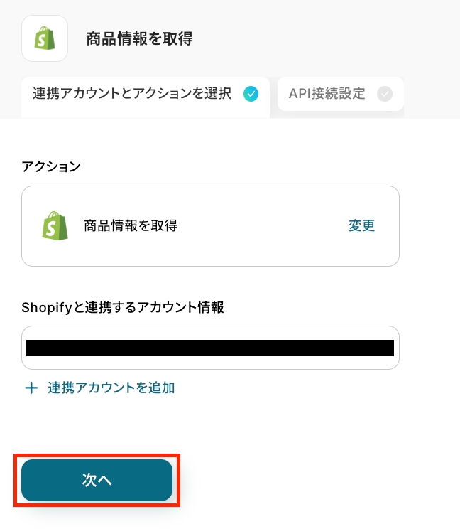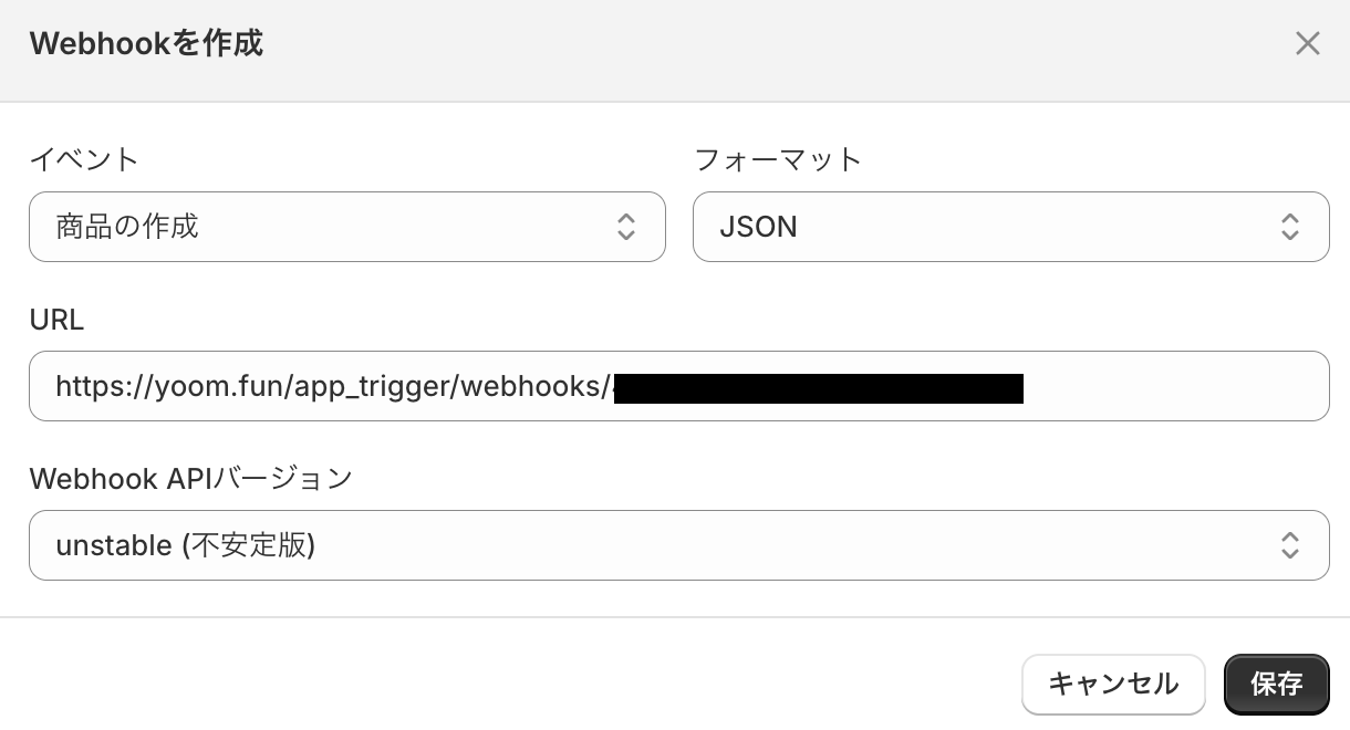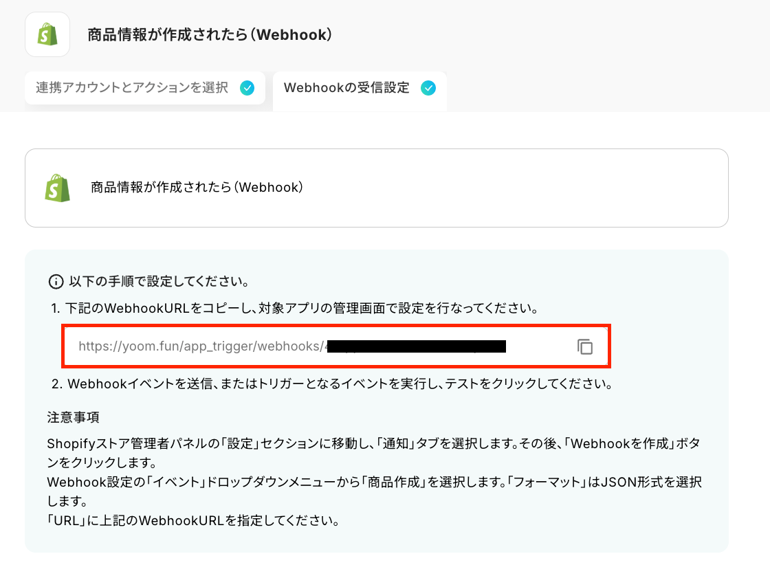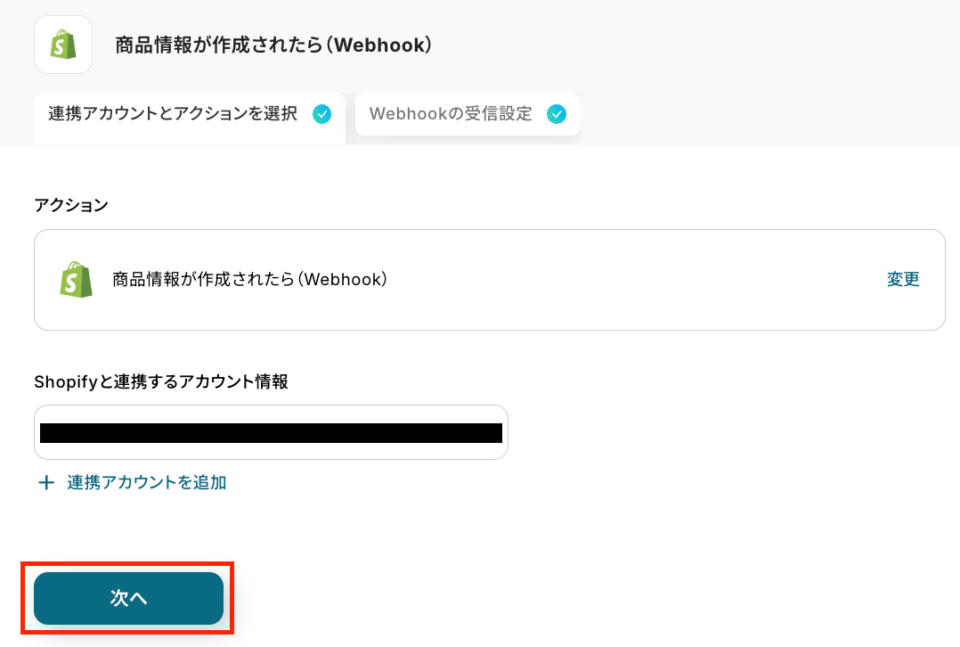 アクションは「商品情報が作成されたら(Webhook)」のままでOKです!