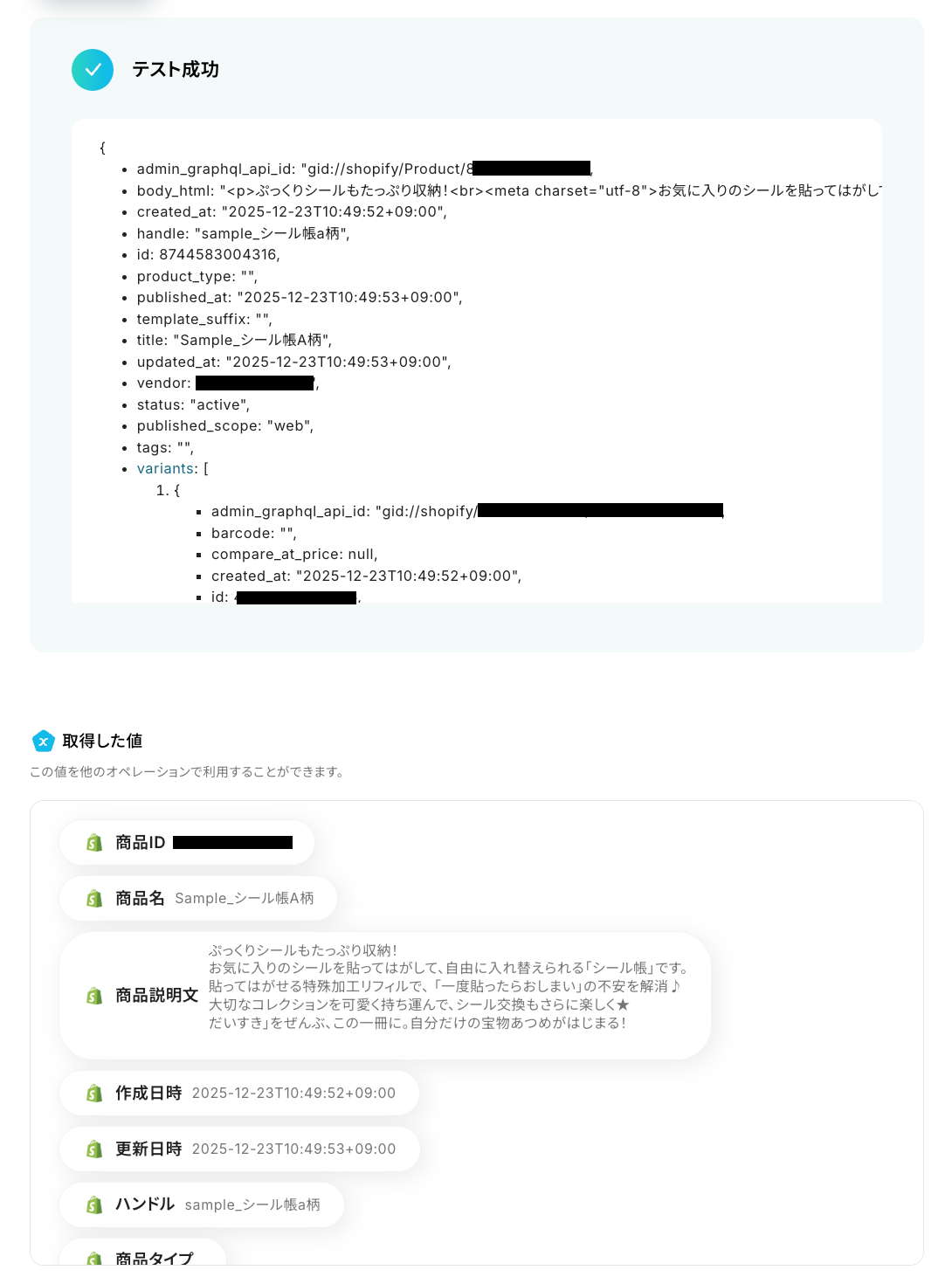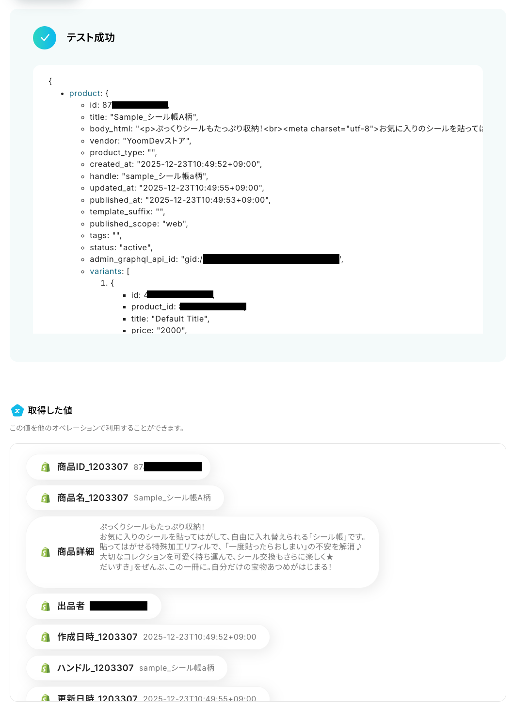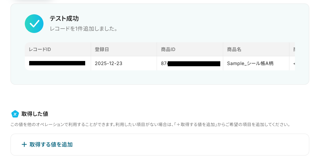 テストが成功すると、先ほど作成した商品の情報が「取得した値」に追加されるので、内容を確認しましょう。