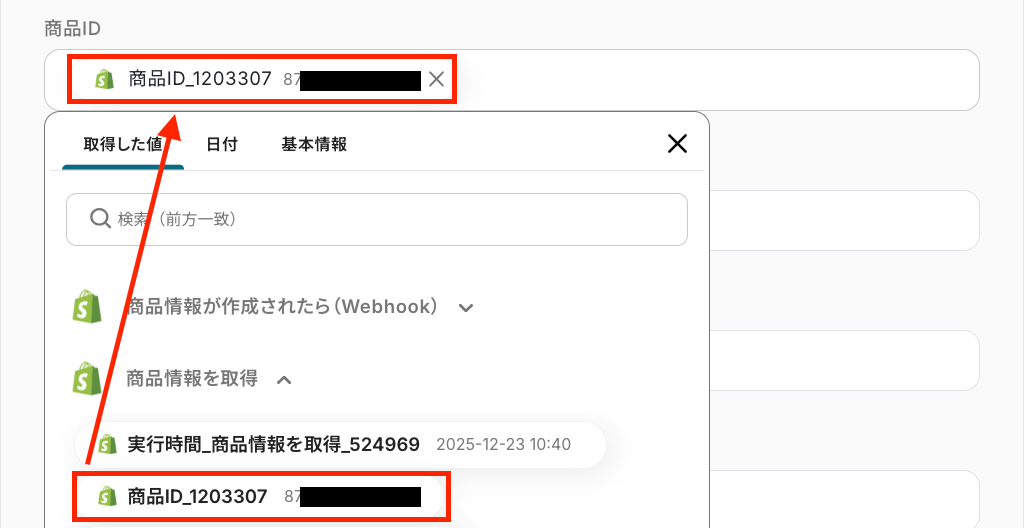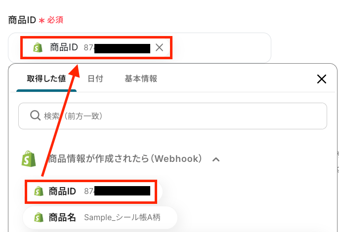 - その後、オペレーションでShopifyの「商品情報を取得する」アクションを設定し、トリガーをきっかけに取得した商品IDをもとに詳細な商品情報を取得します。