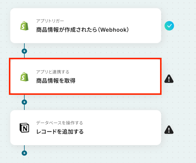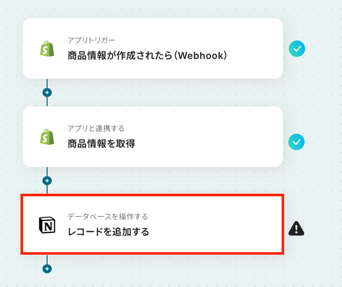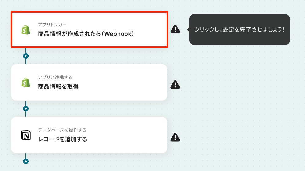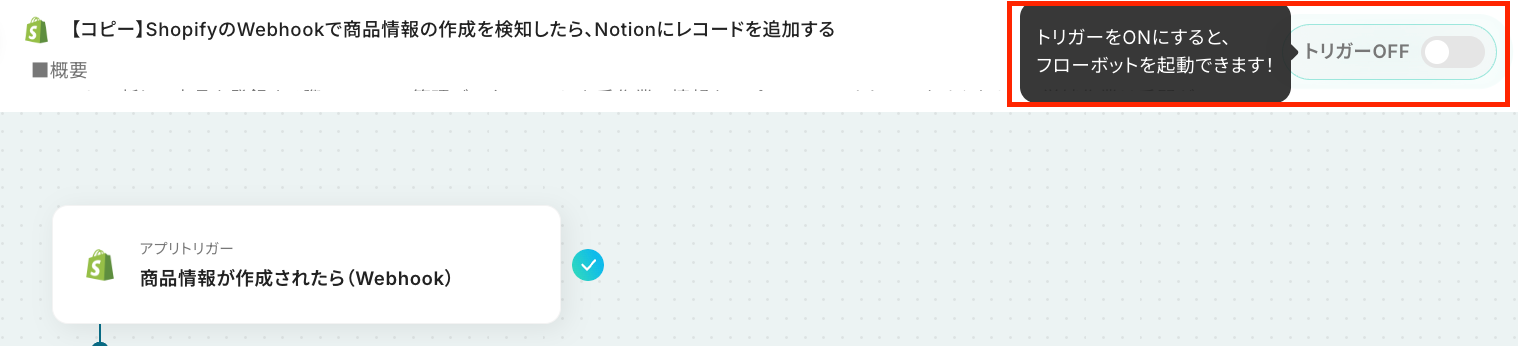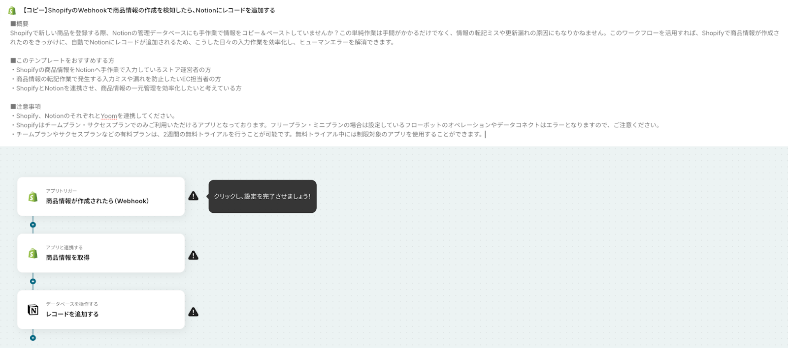 それではここから代表的な例として、「Shopifyで商品情報が作成された際に、その情報をNotionのデータベースに自動でレコード追加する」フローの設定手順を解説していきます!