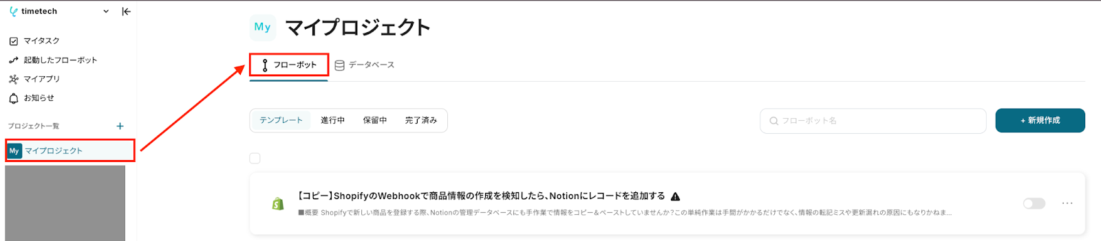 Yoomの画面左側にあるメニュー欄から「マイプロジェクト」にアクセスし、「フローボット」を選択してください。「【コピー】ShopifyのWebhookで商品情報の作成を検知したら、Notionにレコードを追加する」という名前で格納されているはずです。