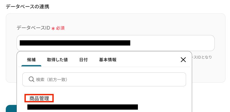 - Notionのレコード取得や更新のアクションでは、検索・更新対象のレコードを指定する項目を、固定値や前段で取得した情報を用いて設定可能です。